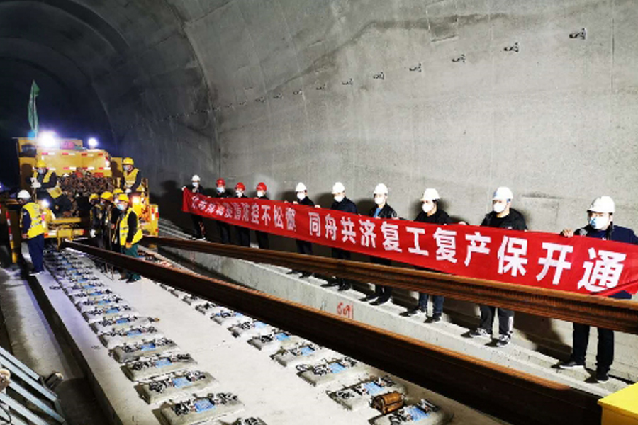 自3月1日复工以来,铁路工人们加班加点,衢宁铁路松阳段正线铺轨工程于3月5日全线正式完工。衢宁铁路松阳段全长41.442公里,为有砟、无砟轨道相结合,其中,正线有砟铺轨19.465公里,无砟21.977公里,站线铺轨7.819公里。图为铁路铺轨施工现场。