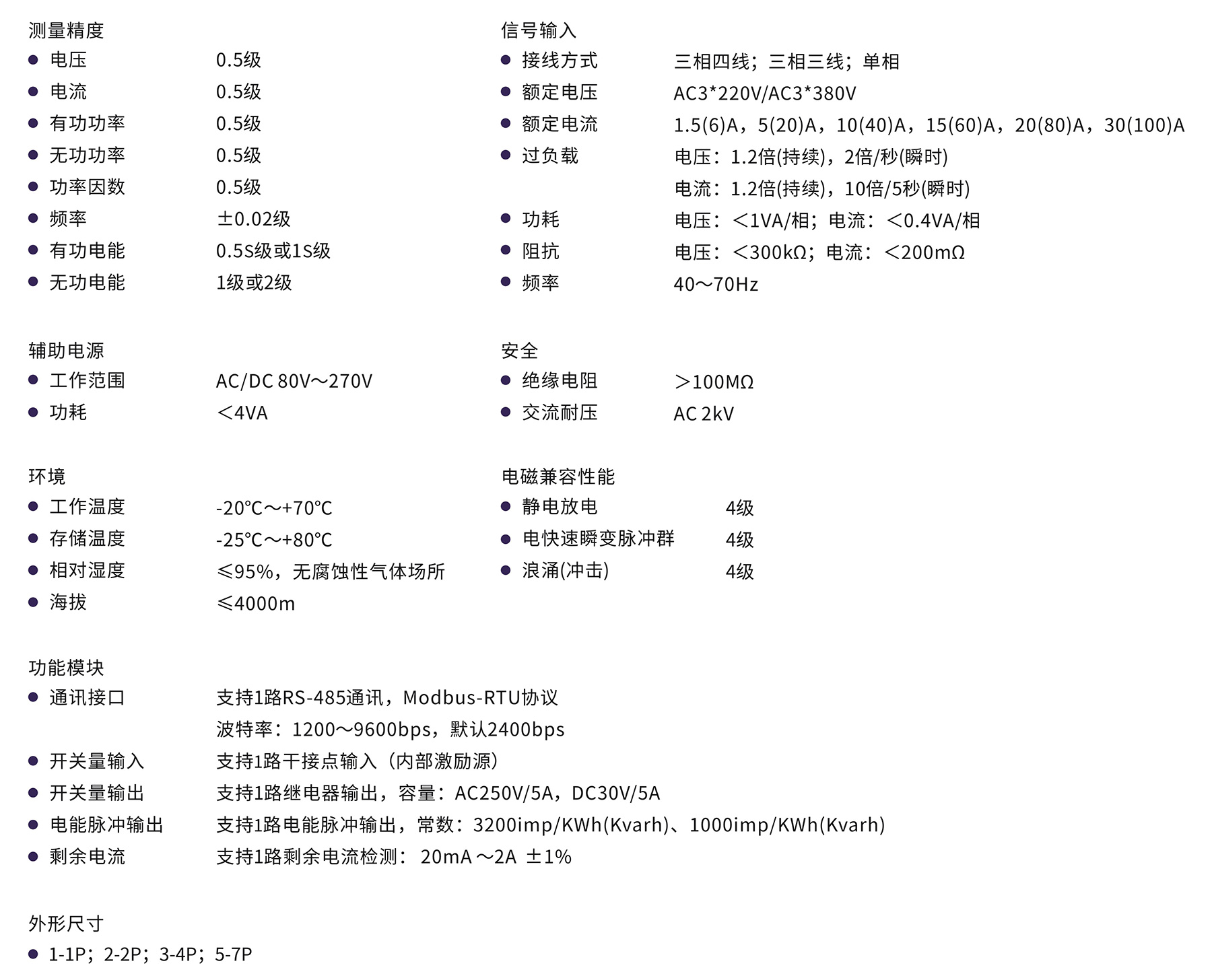 高精度分项电能计量,有功/无功电能计量、双向计量,可选配多功能电参数