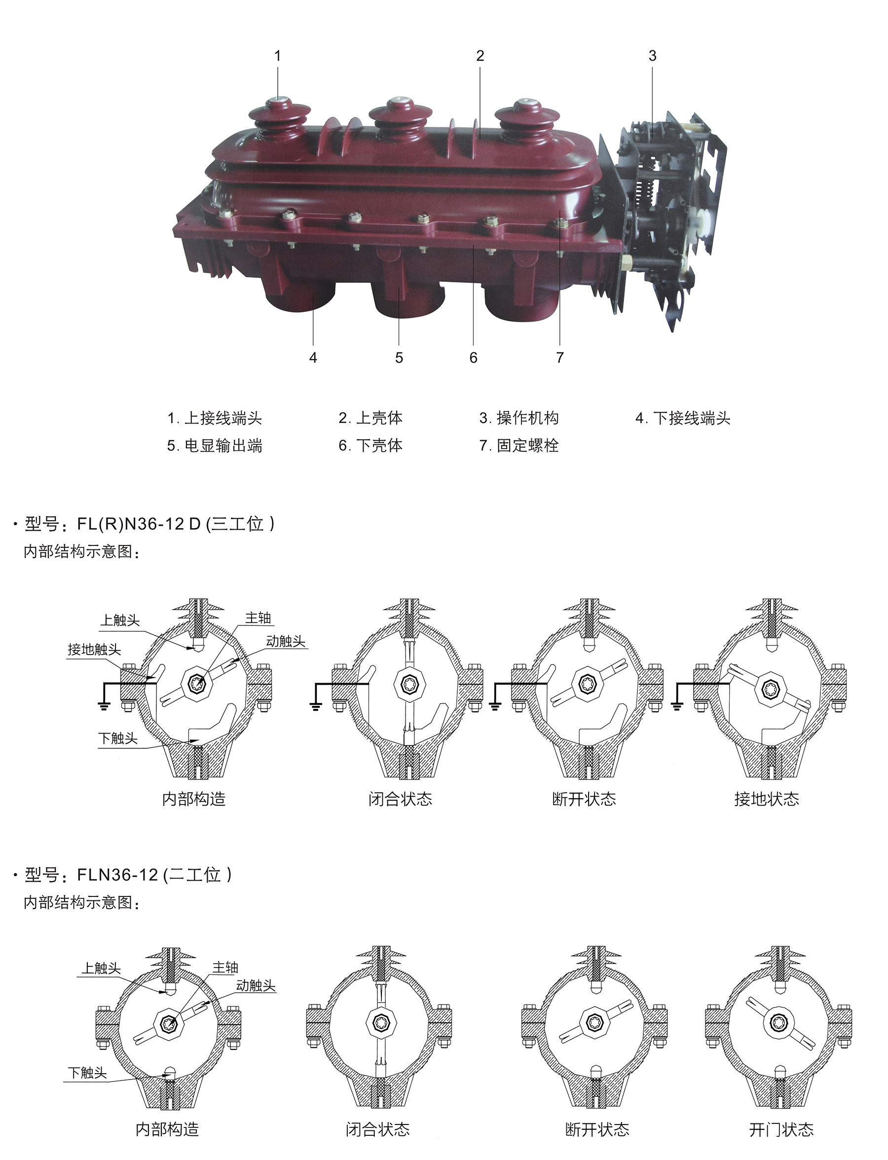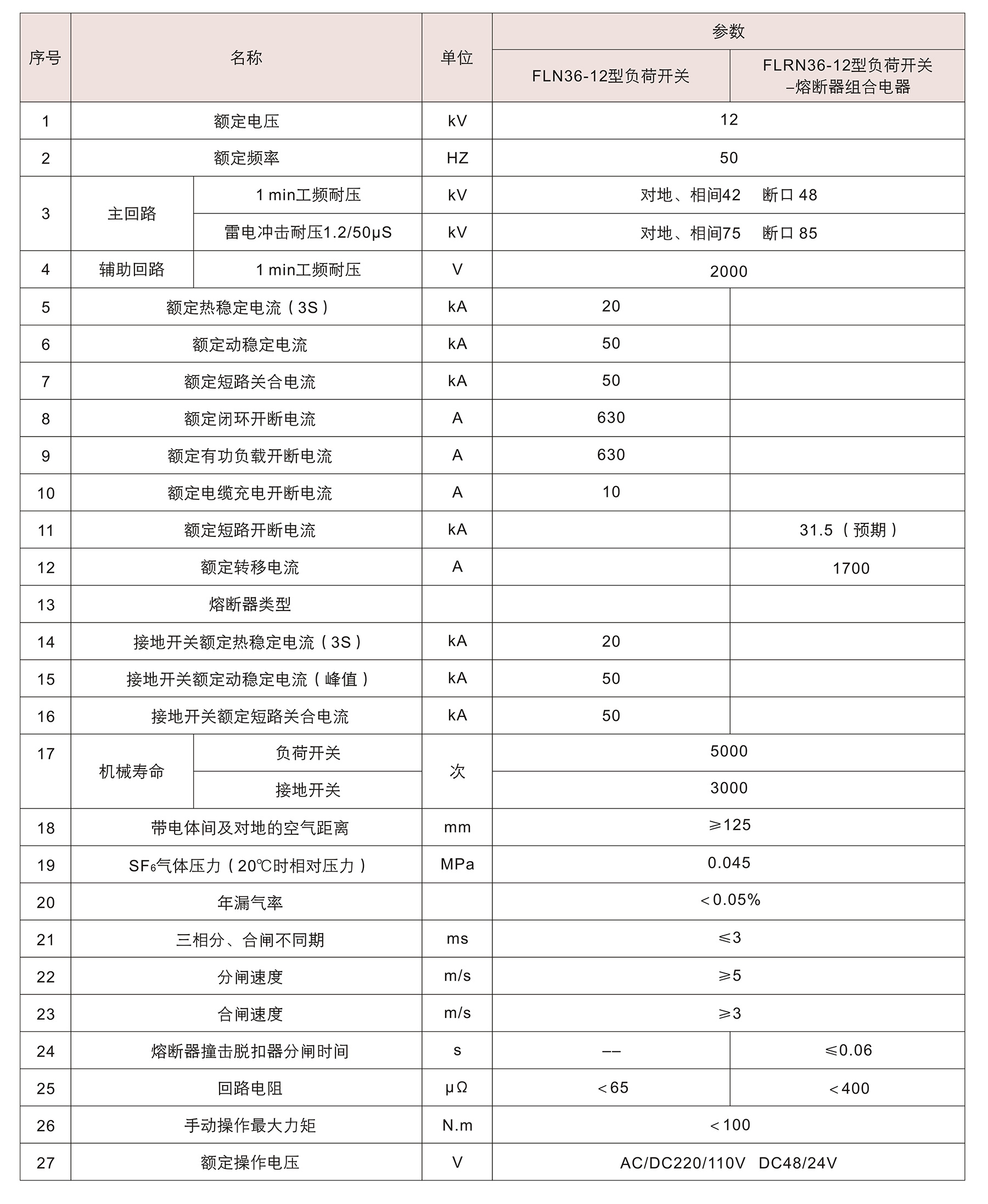 本负荷开关是一种以SF6气体为绝缘和灭弧介质的双断口旋转型负荷开关,适用于12kv的配电系统。每个开关充以0.045MP- 0.06MP气压SF6气体后是永久密封的。开关垂直或水平安装不限,在环网柜内典型的安装方式是在电缆室和母线室之间置一钢隔板水平安装。这种安装方式将母线与电缆线接头之间相隔离以符合运行维护的最严格的安全要求。