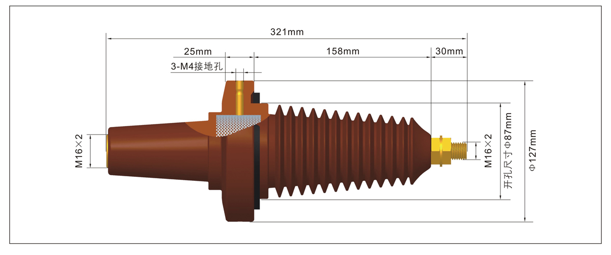 630A36kV套管座,为630A电缆接头提供接口,主要用于箱变、户外环网开关柜等设备。安装在箱变的一侧和高压绕组连接,安装在户外环网柜上做630A出线侧。与屏蔽型螺栓式电缆接头连接。其材料为一种环氧树脂,具有良好的机械和电气性能。