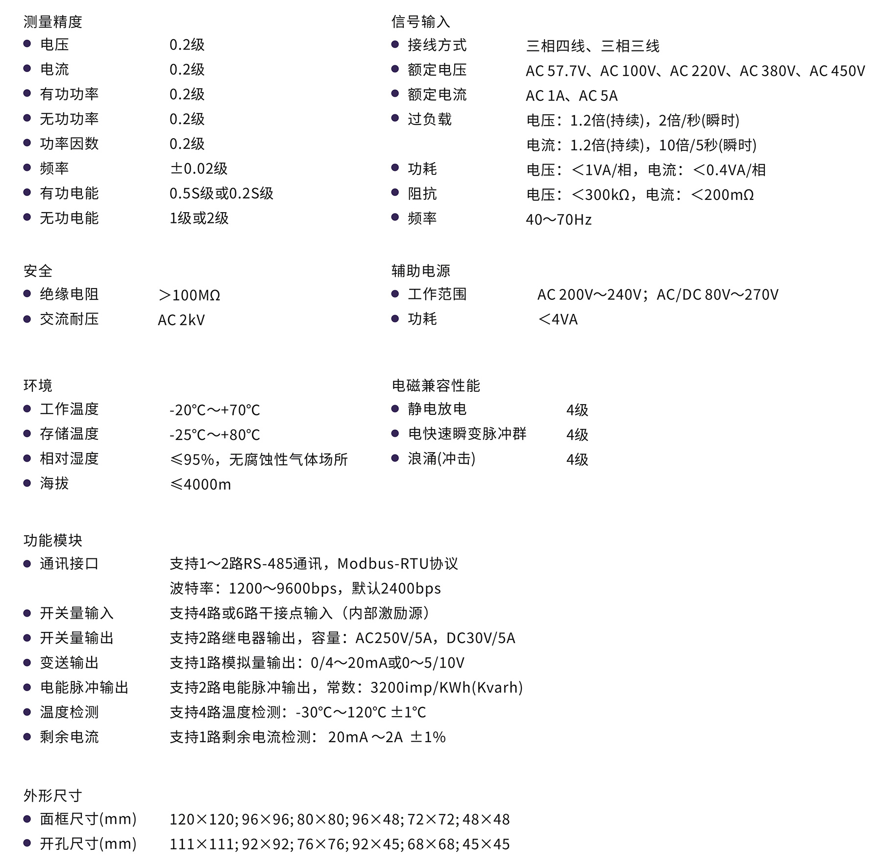 可选配功能:电压/电流谐波畸变率、开关量输入输出。