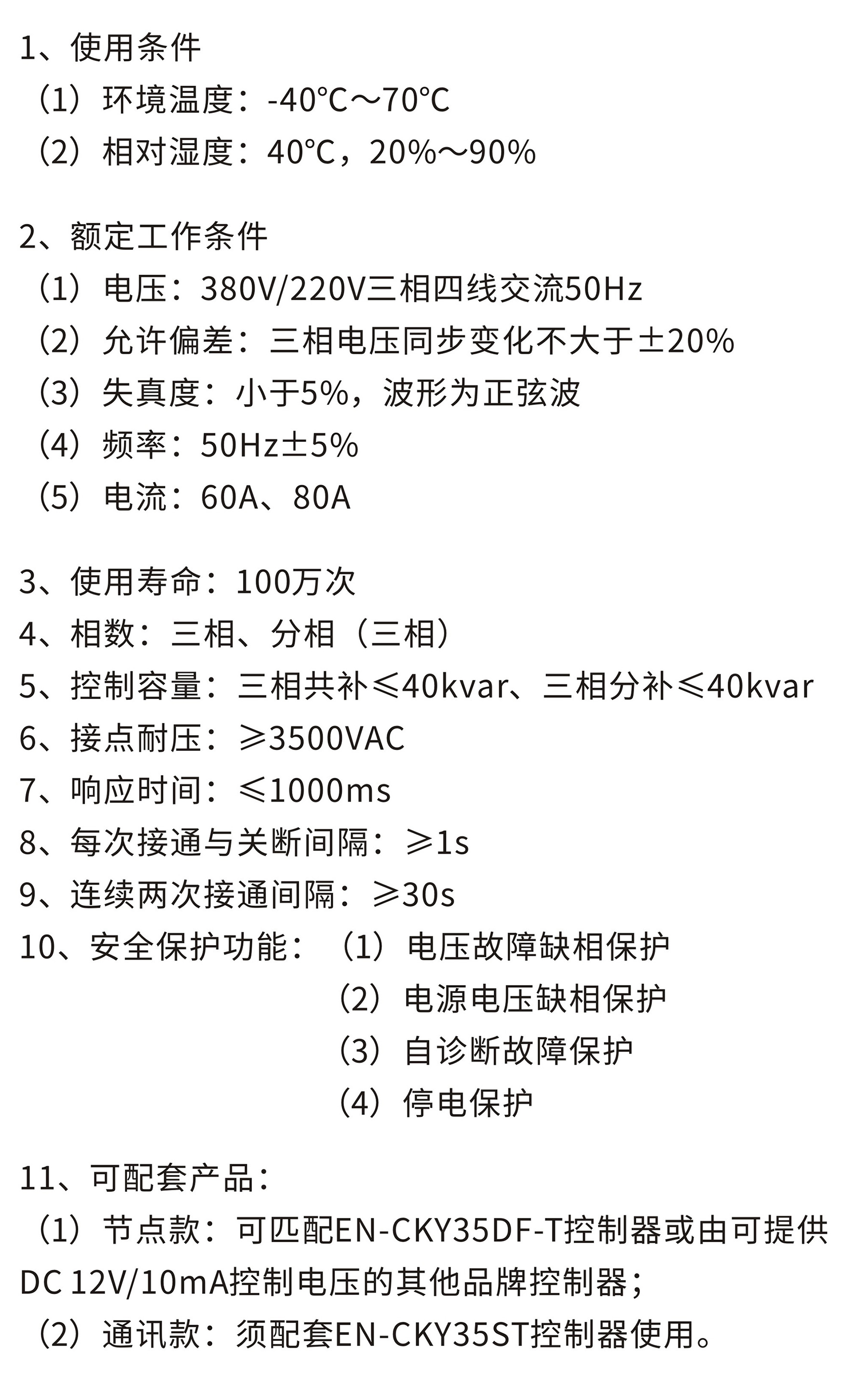 接到外部控制信号后,通过开关内部CPU智能判断,自动寻找最佳投切点,保证过零投切,涌流小,触点不烧结,能耗小。同时具有电压异常保护、缺相保护、元件故障保护、运行指示等功能。